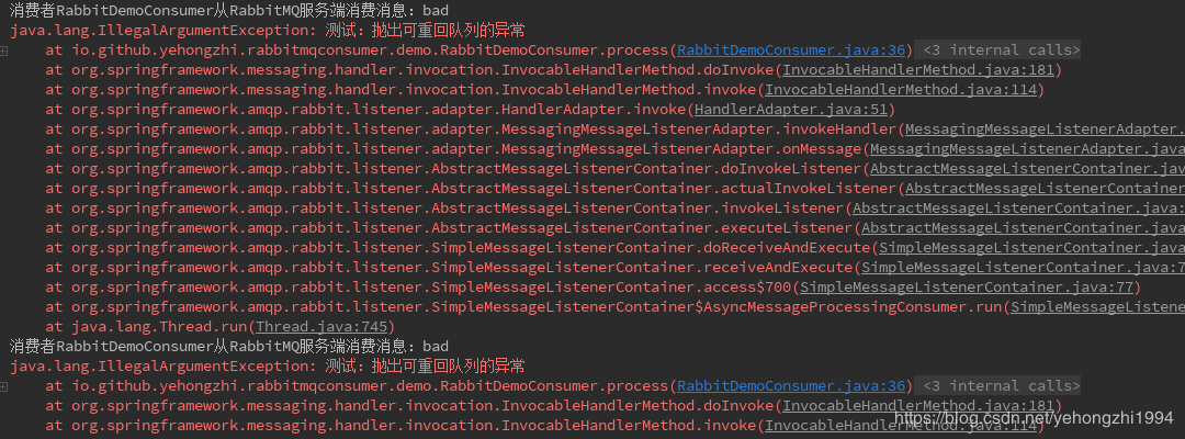 上面的代码我故意写了一个bug。测试发送一条"bad",然后会抛出重回队列的异常。这就有个问题:重回队列后消费者又消费,消费抛出异常又重回队列,就造成了死循环。