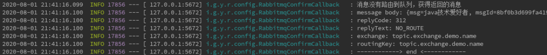 我这里就简单地打印回调方法返回的消息,在实际项目中,可以把返回的消息存储到日志表中,使用定时任务进行进一步的处理。