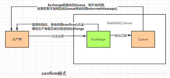 一条消息从生产者发送到RabbitMQ,首先会发送到Exchange,对应回调函数confirm()。第二步从Exchange路由分配到Queue中,对应回调函数则是returnedMessage()。