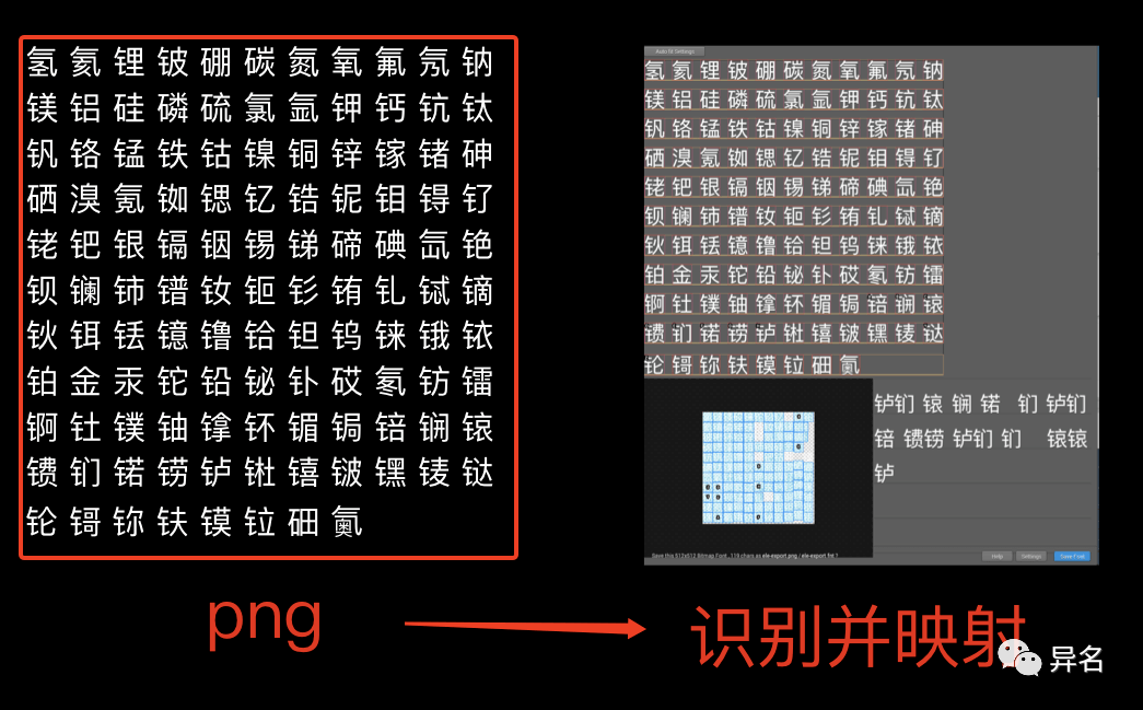 当然在游戏中,更常见的方式是使用位图字体,位图字体由 fnt 格式的字体文件和一张png图片组成,fnt文件提供了对每一个字符小图的索引,这种格式的字体可以由专门的软件生成,异名用的是shoebox。因为位图字体是一个符号和图片的索引文件,所以我们可以把某个场景下具有特色的字体都单独做设计,当然也可以应用在生僻字的显示中: