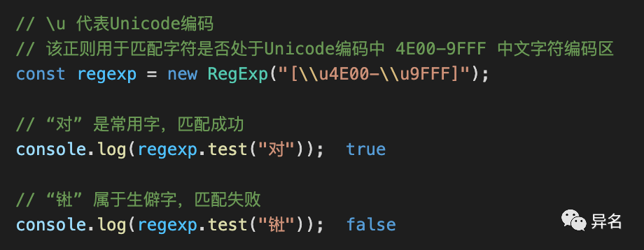通常情况下,我们日常所用到的中日韩非符号字符都会落在3400-9fff这个编码区间,因此当我们需要判断某一个字符是否是属于汉字的时候,就可以通过查看它的的Unicode编码是否落在这个区间,我们写一个正则去检查一下上面两个字符👇: