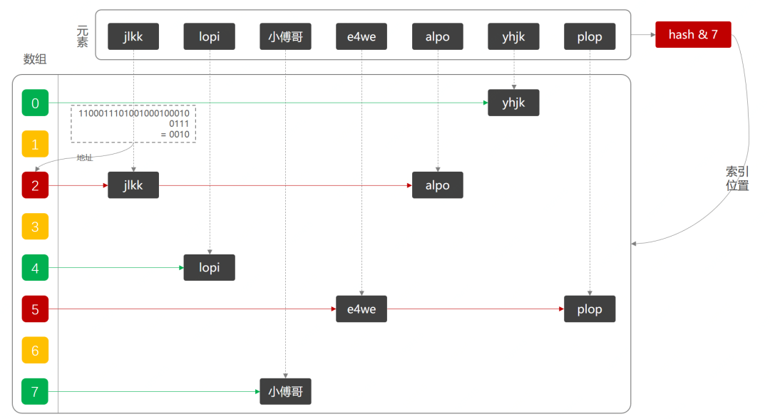 黄色的索引ID是没有元素存放、绿色的索引ID存放了一个元素、红色的索引ID存放了两个元素。