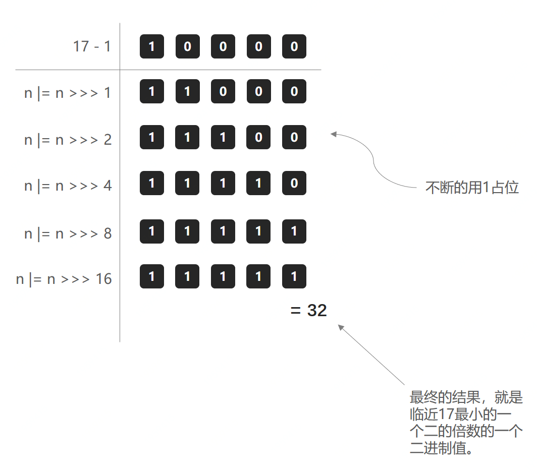 这个方法也就是要寻找比初始值大的,最小的那个2进制数值。比如传了17,我应该找到的是32。
