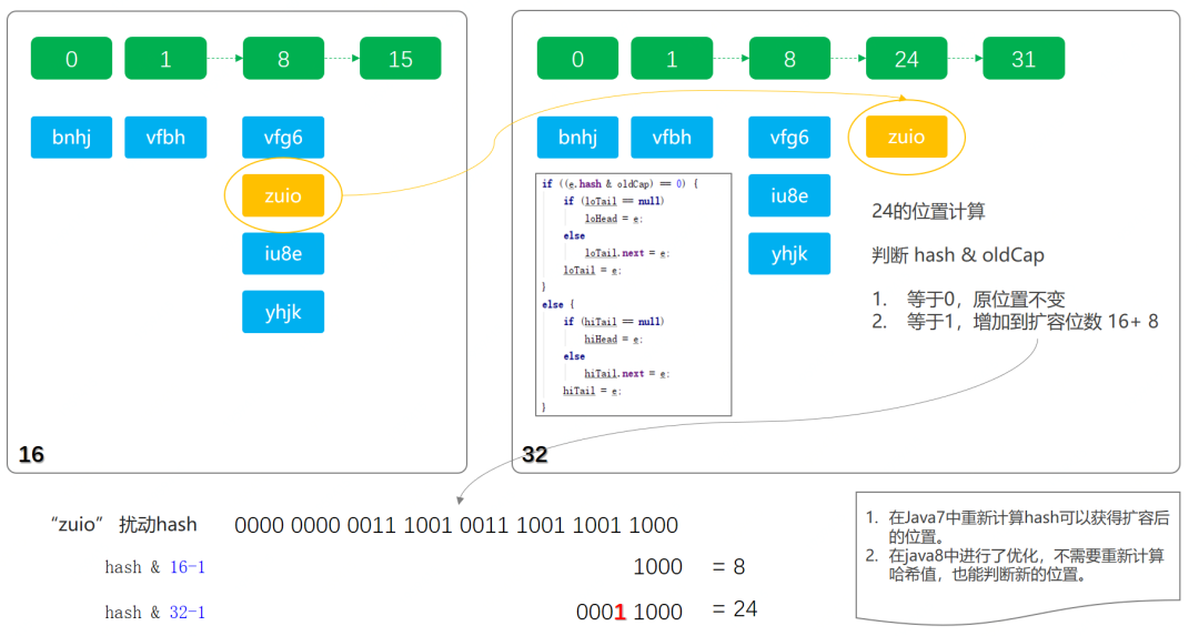其中黄色区域元素 zuio因计算结果hash & oldCap不为1,则被迁移到下标位置24。 -