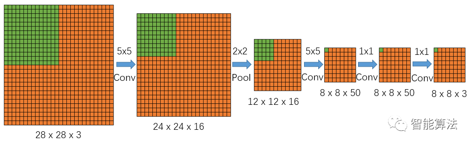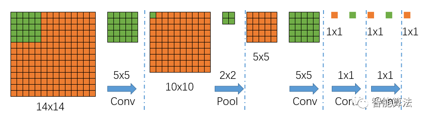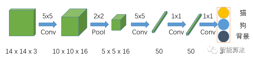 从上图中,我们可以看到,输入是一个14x14大小的图片,经过一个5x5的卷积(不填充)后,得到一个10x10的特征图,然后再经过一个2x2的池化后,尺寸缩小到一半变成5x5的特征图,再经过一个5x5的卷积后,特征图变为1x1,接着后面再进行两次1x1的卷积(类似全连接操作),最终得到一个1x1的输出结果,那么该1x1的输出结果,就代表最前面14x14图像区域的分类情况,如果对应到上面的猫狗和背景的分类任务,那么最后输出的结果应该是一个1x3的矩阵,其中每个值代表14x14的输入图片中对应类别的分类得分。