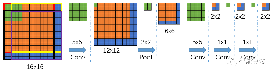 我们可以看到上面的图,输入尺寸由原来的14x14变成了16x16,那么经过一个5x5的卷积(不填充)后,得到一个12x12的特征图,然后再经过一个2x2的池化后,尺寸缩小到一半变成6x6的特征图,再经过一个5x5的卷积后,特征图变为2x2,接着后面再进行两次1x1的卷积(类似全连接操作),最终得到一个2x2的输出结果,那么该2x2的输出结果,就代表最前面16x16图像区域的分1类情况,然而,输出是2x2,怎么跟前面对应呢?