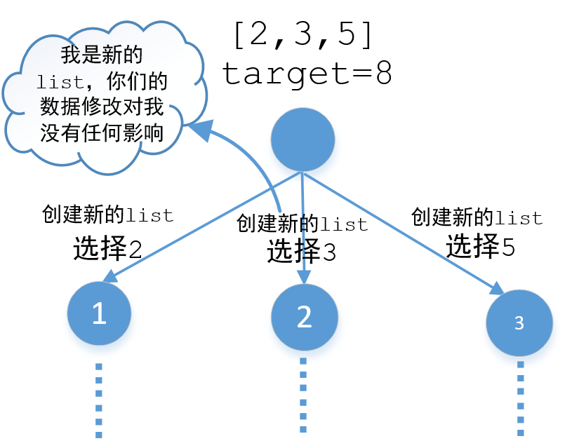 当我们选择2的时候是一个分支,当我们选择3的时候又是另外一个分支,这两个分支的数据应该是互不干涉的,但实际上当我们沿着选择2的分支走下去的时候list中会携带选择2的那个分支的数据,当我们再选择3的那个分支的时候这些数据还依然存在list中,所以对选择3的那个分支造成了污染。有一种解决方式就是每个分支都创建一个新的list,也就是下面这样,这样任何一个分支的修改都不会影响到其他分支。