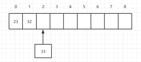 数组是用连续的内存空间来存储数据的,则每次添加的时候会往当前数组的最后一个元素上添加元素,一次就可以加上元素,所以它的复杂度为O(1),假如定义一个长度为9数组,数组中已经有两个元素,则添加第三个元素如下: