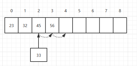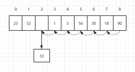 首先,将索引为3的元素移动到索引为4的位置,然后将索引为2的元素移动到索引为3的位置,最后将33添加到索引为2的位置。理论上插入一个元素需要移动元素的个数为N/2个,所以它的时间复杂度为O(N)。