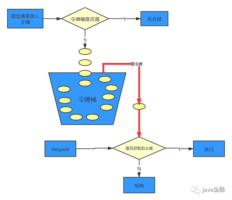 看图的话是不是令牌桶和漏桶都差不多,只不过令牌桶新增了一个匀速生产令牌的中间人以恒定的速度往桶里面放令牌,如果令牌的数量超过里桶的限制的话,令牌就会溢出,这时候就直接舍弃多余的令牌。每个请求过来必须拿到桶里面拿到了令牌才允许请求(拿令牌的速度是不限制的,这就意味着如果瞬间有大量的流量请求进来,可以短时间内拿到大量的令牌),拿不到令牌的话直接拒绝。这个令牌桶的思想是不是跟我们java里面的「Semaphore」 有点类似。Semaphore 是拿信号量,用完了就还回去。但是令牌桶的话,不需要还回去,因为令牌会定时的补充。令牌桶算法我们可以通过Google开源的guava包创建一个令牌桶算法的限流器。
