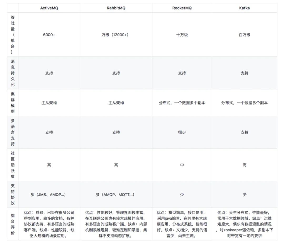 3.RocketMQ 阿里出品,Java 系开源项目,源代码我们可以直接阅读,然后可以定制自己公司的MQ,并且 RocketMQ 有阿里巴巴的实际业务场景的实战考验。RocketMQ 社区活跃度相对较为一般,不过也还可以,文档相对来说简单一些。还有就是阿里出台的技术,你得应对这个技术万一被抛弃,社区黄掉的风险,如果你们公司有技术实力我觉得用RocketMQ 挺好的。 -
