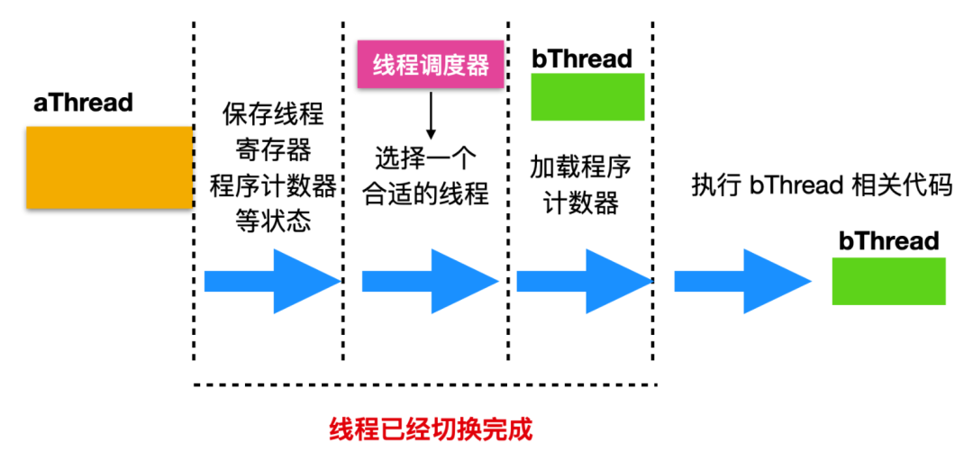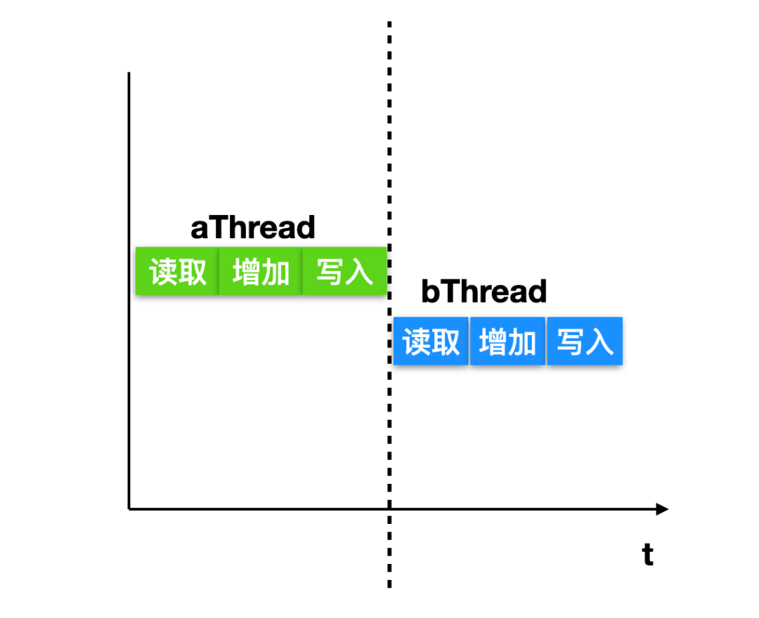 可以看到,当 aThread 在执行完整个 i++ 的操作后,操作系统对线程进行切换,由 aThread -> bThread,这是最理想的操作,一旦操作系统在任意 读取/增加/写入 阶段产生线程切换,都会产生线程安全问题。例如如下图所示