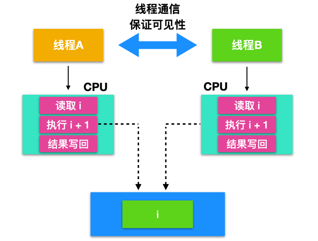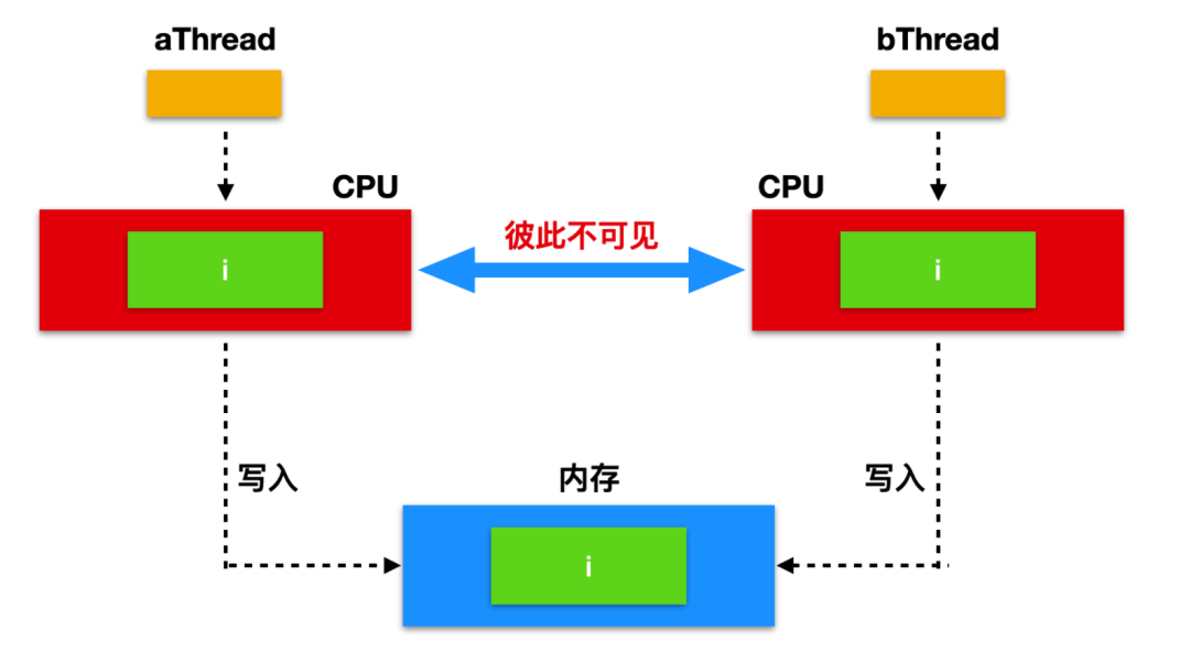 当两个线程开始运行后,每个线程都会把 i 的值读入到 CPU 缓存中,然后执行 + 1 操作,再把 + 1 之后的值写入内存。因为线程间都有各自的虚拟机栈和程序计数器,他们彼此之间没有数据交换,所以当 aThread 执行 + 1 操作后,会把数据写入到内存,同时 bThread 执行 + 1 操作后,也会把数据写入到内存,因为 CPU 时间片的执行周期是不确定的,所以会出现当 aThread 还没有把数据写入内存时,bThread 就会读取内存中的数据,然后执行 + 1操作,再写回内存,从而覆盖 i 的值,导致 aThread 所做的努力白费。