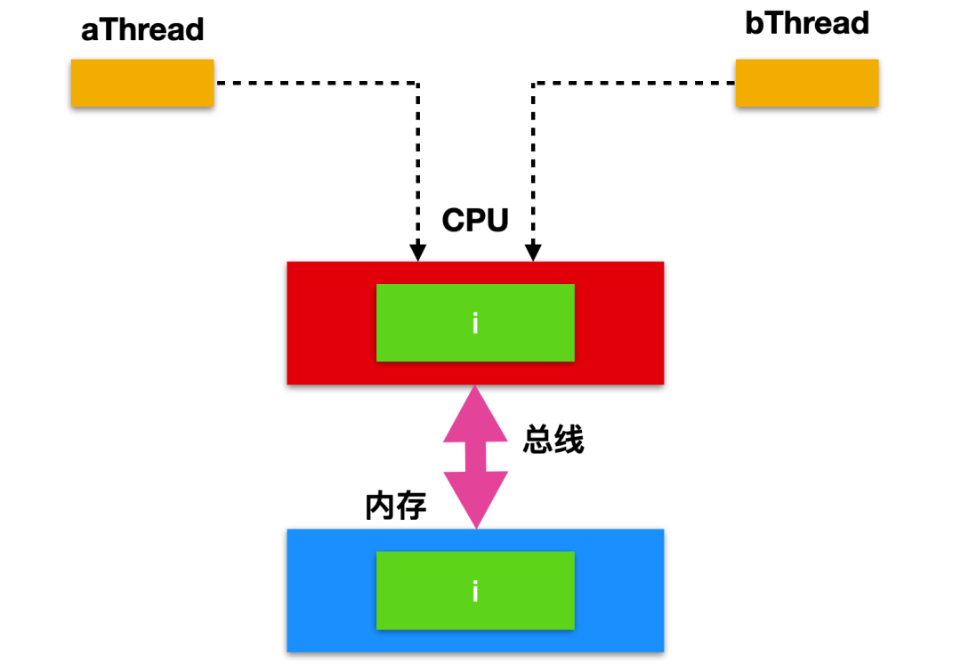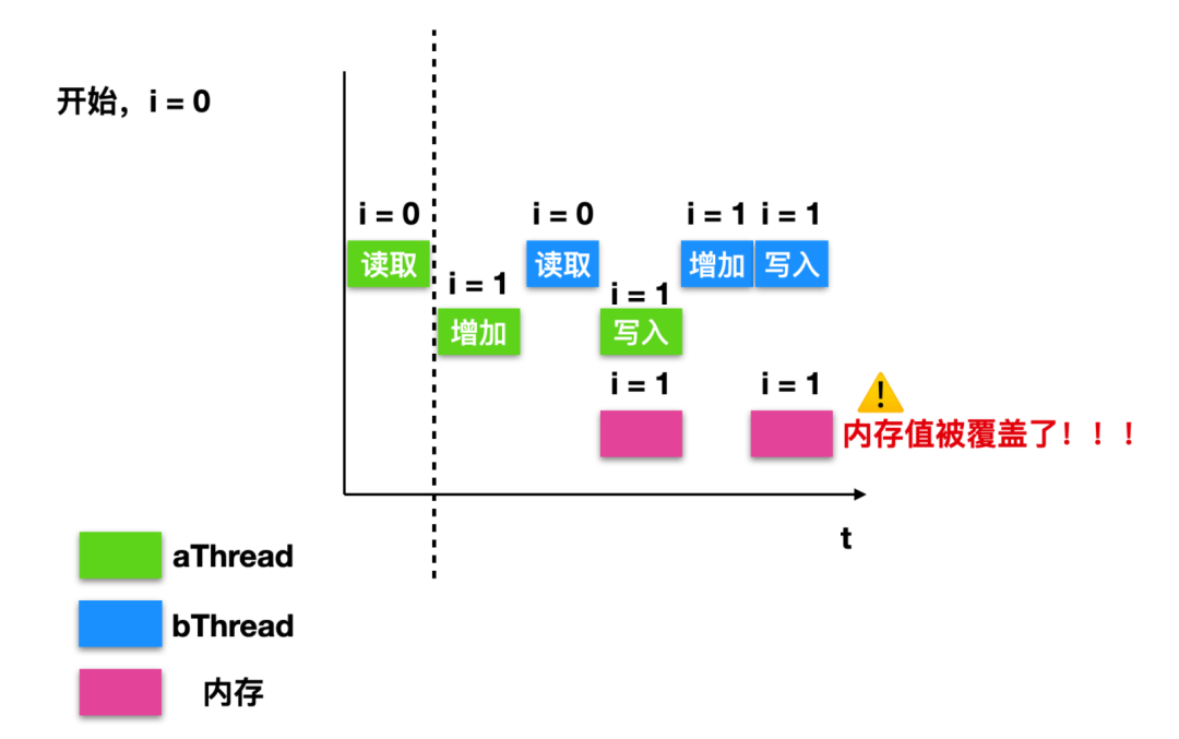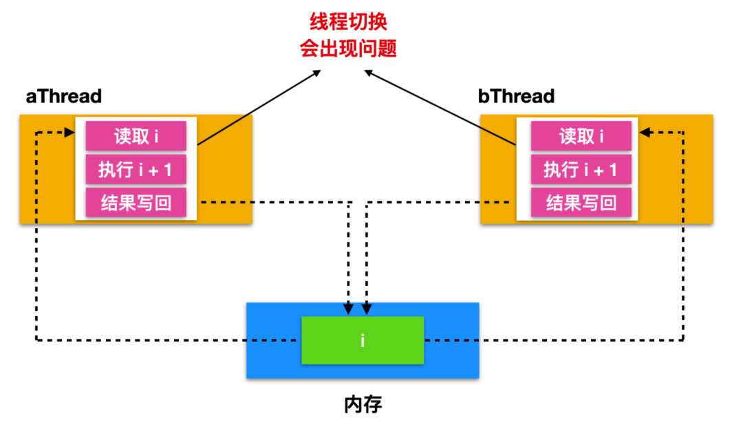 最开始的时候,内存中 i = 0,aThread 读取内存中的值并把它读取到自己的寄存器中,执行 +1 操作,此时发生线程切换,bThread 开始执行,读取内存中的值并把它读取到自己的寄存器中,此时发生线程切换,线程切换至 aThread 开始运行,aThread 把自己寄存器的值写回到内存中,此时又发生线程切换,由 aThread -> bThread,线程 bThread 把自己寄存器的值 +1 然后写回内存,写完后内存中的值不是 2 ,而是 1, 内存中的 i 值被覆盖了。