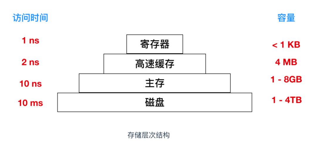CPU 内部是寄存器的构造,寄存器的访问速度要高于高速缓存,高速缓存的访问速度要高于内存,最慢的是磁盘访问。