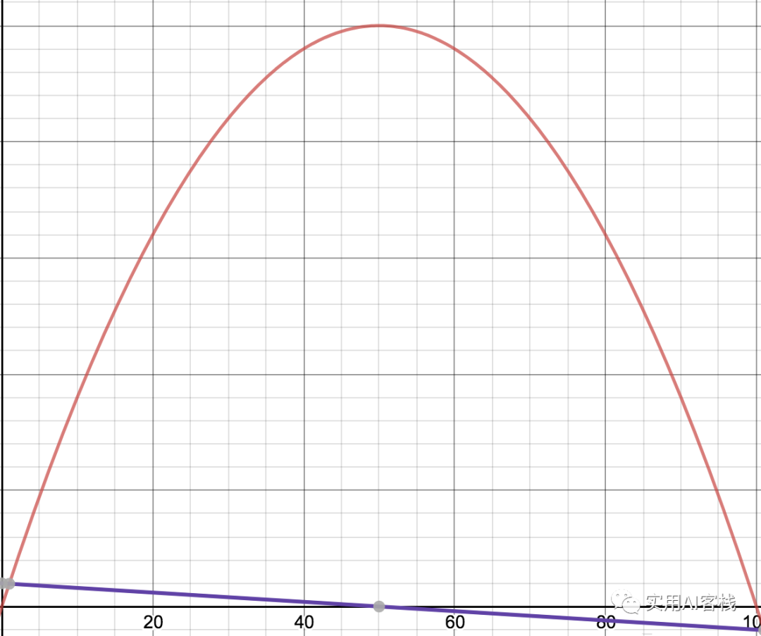 这并不能确认矩阵面积最大时对应长度值就是50,或者某些时候有比50更好的点,不过这种近似的方法最终将应用于训练模型。对于这个简单的问题,通过绘制函数了解该方法和实际的误差: