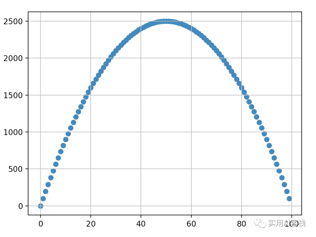 我们从围栏数据库中收集了很多数据样本。我们数据集中的每个数据点的背景都是来自用100米围栏材料来建造矩形牧场。每个数据点有2个参数:围栏一侧的长度和围栏的面积。在这个问题中,不是尝试找到围栏的最佳长度,而是试图找到一个函数,该函数可以根据给定的边长来预测矩形围栏的面积。我们的输入数据如下所示: