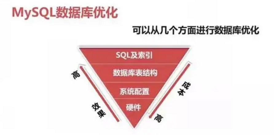 有朋友疑问到,SQL 优化真的有这么重要么?如下图所示,SQL 优化在提升系统性能中是:成本最低和优化效果最明显的途径。