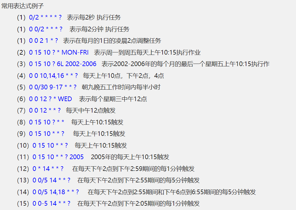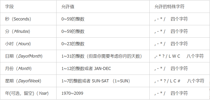 Spring Task 的实现需要使用 cron 表达式来声明执行的频率和规则,cron 表达式是由 6 位或者 7 位组成的(最后一位可以省略),每位之间以空格分隔,每位从左到右代表的含义如下: