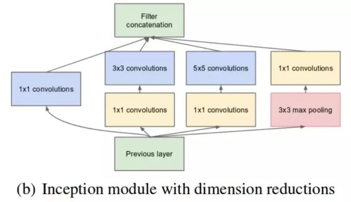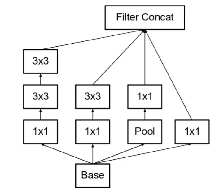 最左侧前一版 Inception 模块中的 5×5 卷积变成了两个 3×3 卷积的堆叠。