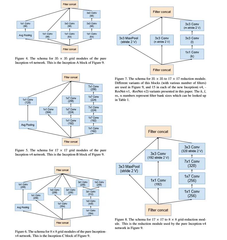 缩减块 A(从 35x35 到 17x17 的尺寸缩减)和缩减块 B(从 17x17 到 8x8 的尺寸缩减)。这里参考了论文中的相同超参数设置(V,I,k)。