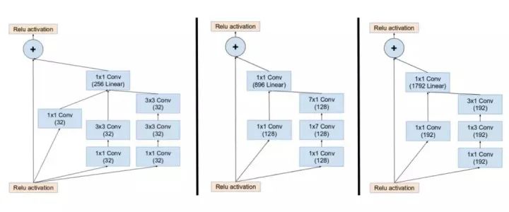 (左起)Inception ResNet 中的 Inception 模块 A、B、C。注意池化层被残差连接所替代,并在残差加运算之前有额外的 1x1 卷积。
