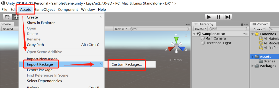 Unity里有一个导入自定义包的功能,通过这个功能,可以在Unity里导入LayaAir引擎提供的专属功能包,用来导出Unity里编辑好的场景和资源,然后再用以LayaAir引擎3D的开发。在Unity里导入这个自定义的LayaAir功能包的过程,我们可以视为安装了一个LayaAir引擎资源导出的Unity插件。本小节会针对这个过程进行详细介绍。