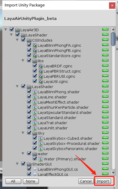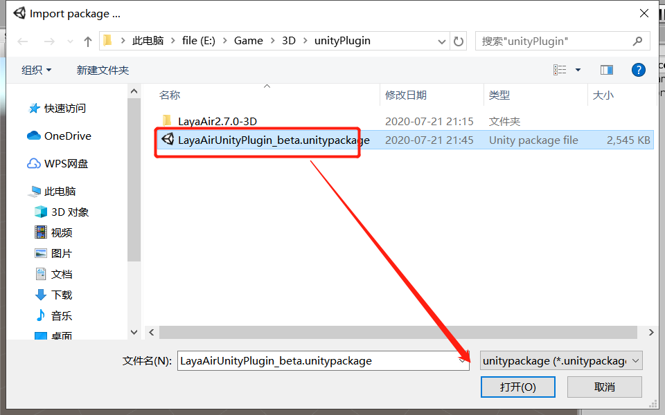 以上的两种导入方式,任选一种点开后,选择之前下载好的LayaAir引擎unity插件(xx.unitypackage)打开,如下图所示。