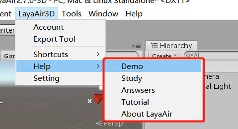 帮助菜单项里,下级菜单有示例Demo、学习文档Study、问答社区Answsers这些外链菜单项,方便开发者快速进入对应的官网页面中。还有插件导出功能说明Tutorial、插件版本About LayaAir,如下图所示。