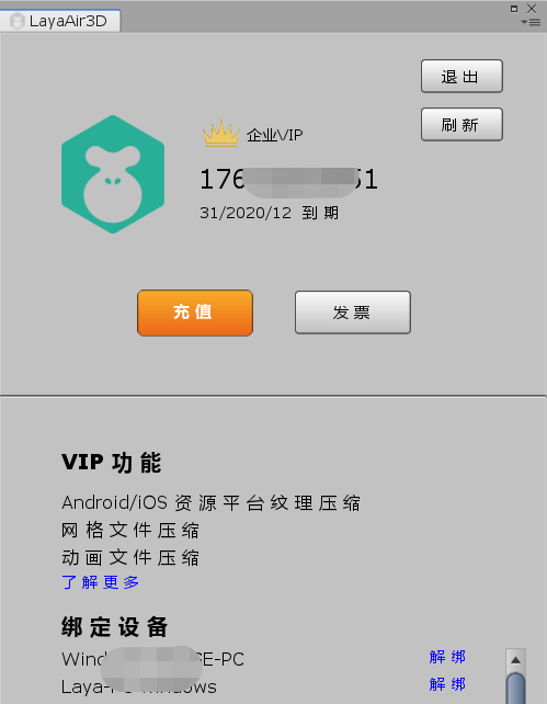 当要使用VIP(增值)功能时,需要从LayaAir3D菜单项的Account登录帐号,购买或使用VIP功能。