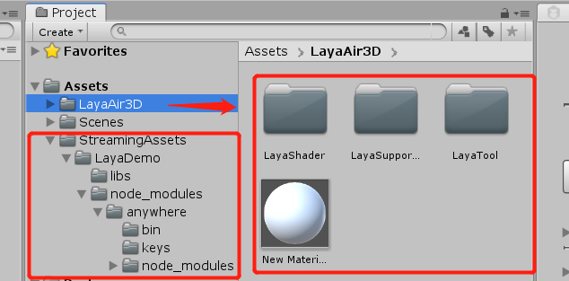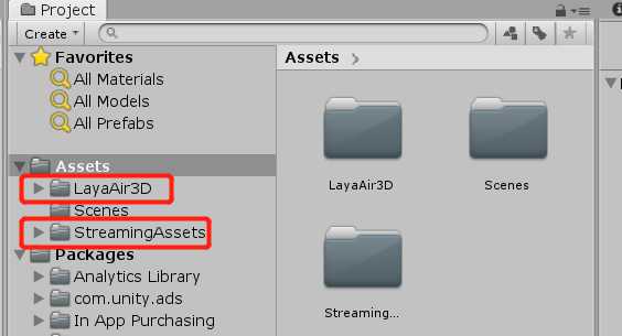 插件导入成功后,开发者可以在Unity的Assets(资源)面板中,看到新增了两个目录,LayaAir3D和StreamingAssets 。如下图所示。