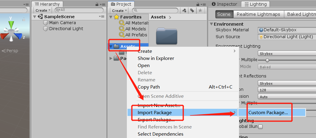 在资源菜单Assets或者资源面板的Assets,右键import Package-> custom Package,如下图所示。