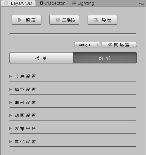 当LayaAir的Unity插件导入成功(安装)后,在Unity中能见到的主要是三个组成模块,我们先对这几个组成模板进行初步的了解。