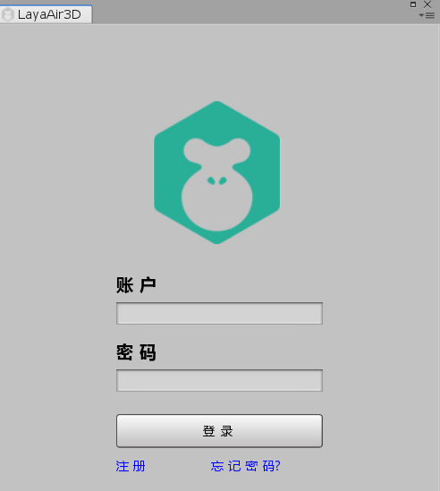 点击LayaAir3D菜单项的Account,弹出登录界面如下图所示。如果已有社区(ask.layabox.com)开发者帐号的开发者可以直接登录,否则也可以点击这个界面的文本链接注册,跳转到注册网页。