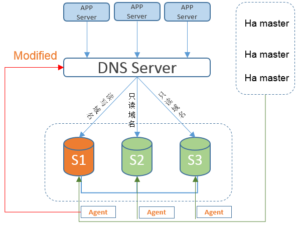 除了对主库支持故障切换外,也具备对从库故障切换的能力。在从库故障宕机时,通过检测故障,再操作域名的方式实现Slave的高可用。