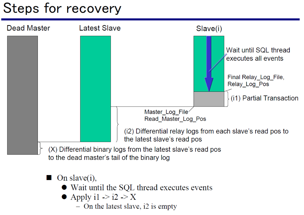 如果是使用gtid复制,需要生成3种diff binlog文件,然后顺序apply diff binlog文件,恢复从库。非gtid复制,先change master到lastest slave,先让slave从lastest slave恢复数据,然后再apply dead master未发送的diff binlog 文件,完成binlog补齐。