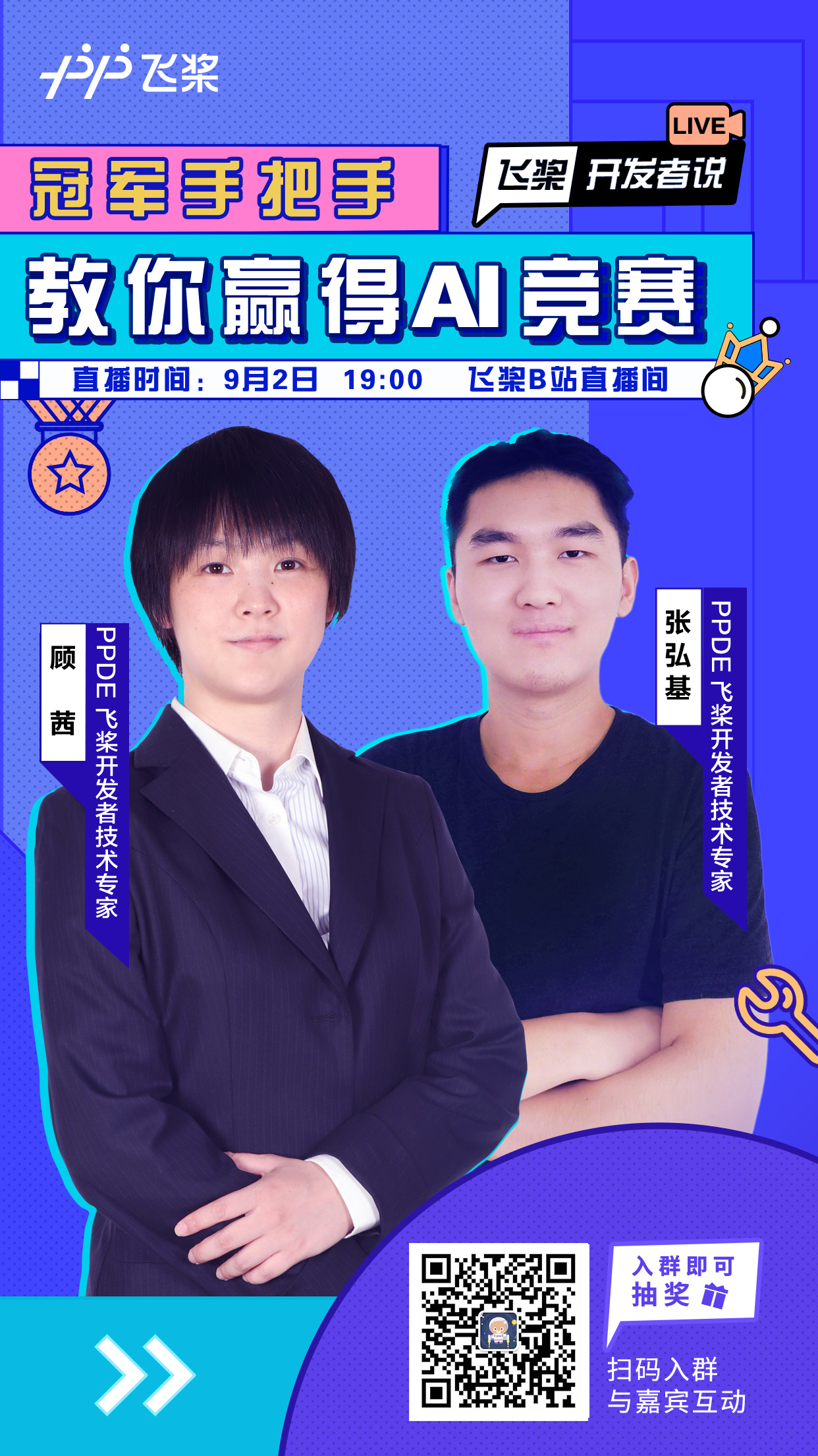 为此,本周三飞桨开发者说的直播,我们特邀比赛经验丰富的两位 PPDE (飞桨开发者技术专家),为大家整理了一些经验心得,同时以九月飞桨常规赛为例,手把手带你上手飞桨常规赛,从赛题讲解、基线说明、到优化思路,不怕听不懂,就怕你不来!