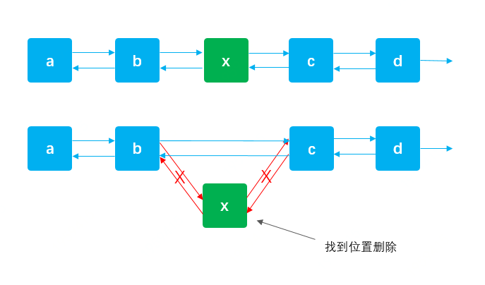确定出要删除的元素x,把前后的链接进行替换。 -