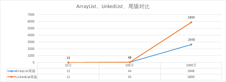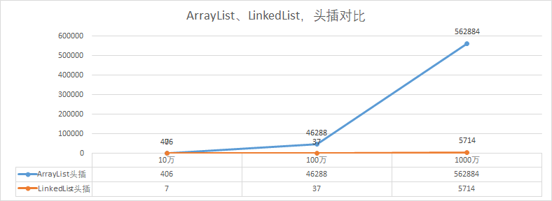 如我们数据结构对比图中一样,ArrayList需要做大量的位移和复制操作,而LinkedList的优势就体现出来了,耗时只是实例化一个对象。
