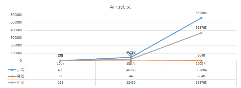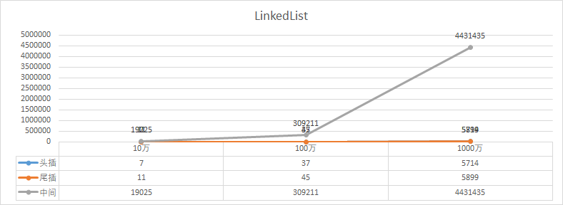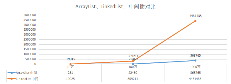 如图,分别是;10万、100万、1000万,数据在两种集合下不同位置的插入效果,「所以:」,不能说LinkedList插入就快,ArrayList插入就慢,还需要看具体的操作情况。