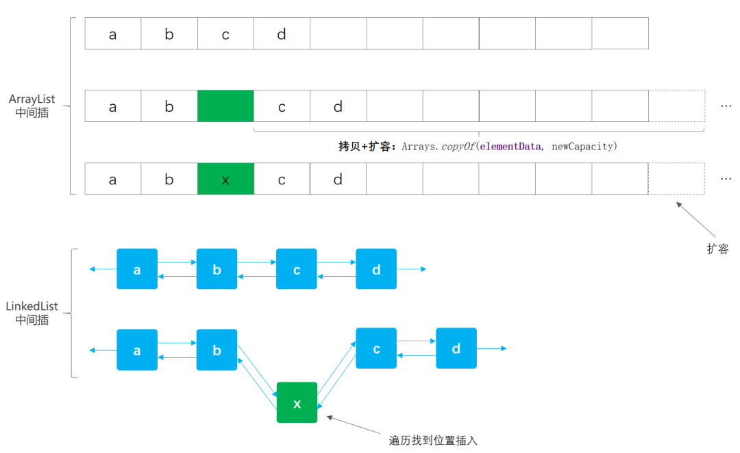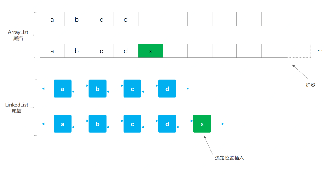 先来看一张数据结构对比图,回顾下ArrayList的插入也和LinkedList插入做下对比,如下;