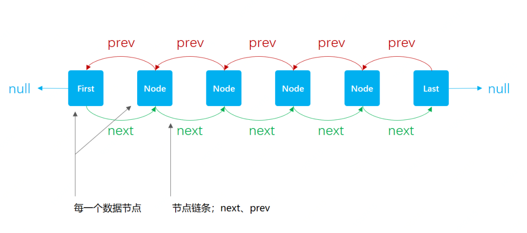 LinkedList,是基于链表实现,由双向链条next、prev,把数据节点穿插起来。所以,在插入数据时,是不需要像我们上一章节介绍的ArrayList那样,扩容数组。