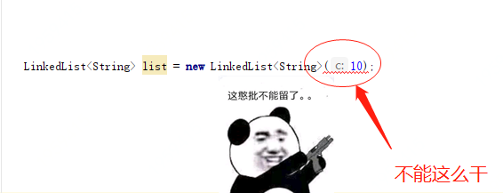 与ArrayList不同,LinkedList初始化不需要创建数组,因为它是一个链表结构。而且也没有传给构造函数初始化多少个空间的入参,例如这样是不可以的,如下;