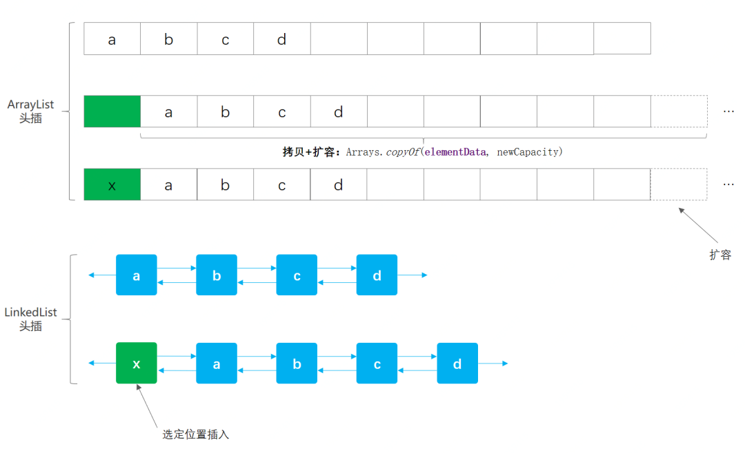 ArrayList 头插时,需要把数组元素通过 Arrays.copyOf的方式把数组元素移位,如果容量不足还需要扩容。 -