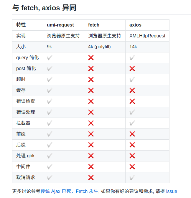 axios是非常优秀的请求库,但肯定也不能满足所有开发者的需求,接下来对比下其他库,看看其他开发者有什么具体需求。
