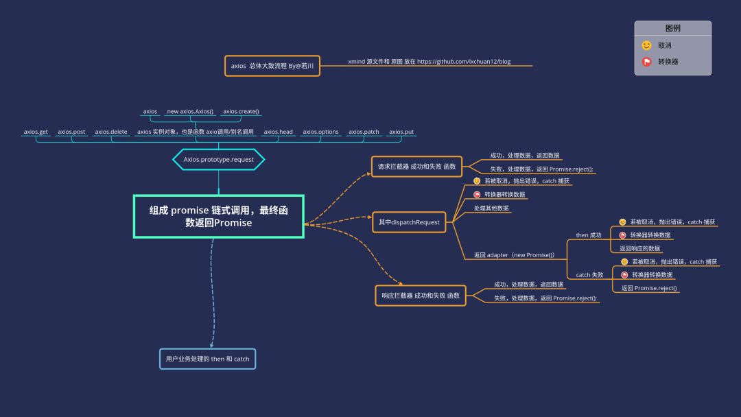 到这里取消的流程就介绍完毕了。主要就是通过传递配置参数cancelToken,取消时才会生成cancelToken,判断有,则抛出错误,使Promise 走向rejected,让用户捕获到消息{message: '用户设置的取消信息'}。