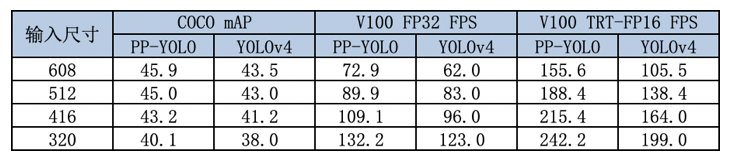 如下表所示,在不同输入尺度下PP-YOLO模型与YOLO v4模型在COCO数据集精度和V100推理速度的交手结果。