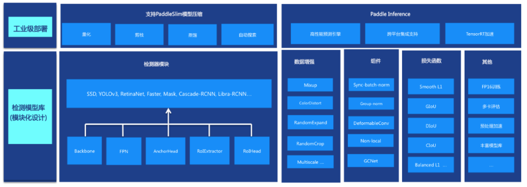 PaddleDetection是基于飞桨核心框架构建的目标检测开发套件,覆盖主流目标检测算法,并提供丰富的预训练模型,帮助开发者快速搭建出各种检测任务框架,高质量完成各类目标检测任务。PaddleDetection采用模块化设计,解耦了检测常用的组件,非常方便开发者按需组合并扩展新的算法。