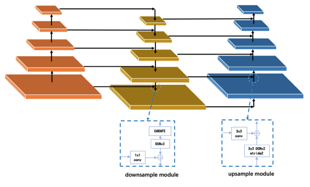 对于传统的二阶段检测器,如R-CNN和FPN系列,通常使用ResNet系列网络作为骨干网络。为了改进此种系列检测器,对于FPN检测器,P3层为微小物体的检测提供了相对应尺度的特征。然而,P3层的不足在于它具有较少的语义信息。因此用PAFPN代替FPN,提高了网络的语义识别能力。与普通的FPN相比,PAFPN增加了一条自下而上的路径,从而提高了基于提议的实例分割框架中的信息流。此外,在下采样模块中,使用“carafe”下采样方法代替原来的卷积模块下采样方法,然后使用可变形卷积模块。在上采样模块中,还使用可变形卷积模块代替原来的卷积模块对特征进行上采样。改进后的PAFPN,提升了1.5%。