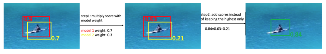 对于难度较大的无人机航拍的小目标检测任务,单尺度单模型显然无法满足图像的复杂以及低信噪比特性,因此,百度视觉团队考虑使用多尺度多模型实现高精度检测。对于模型融合方法,采用具有不同骨干网络(Res2Net, ResNet200,ResNeXt101,SENet154等)的Cascade R-CNN检测器进行融合。对于每个模型,预测了NMS后的边界框。给每个模型一个0到1区间的标量权重。所有权重总和为1,每个模型的盒子的可信度分数乘以其权重,最后合并来自所有模型的框并运行原始的NMS,添加来自不同模型的分数而不是只保留最高的一个。依次顺序使用NMS的修改合并了不同IoU阈值的预测框。最终,模型的达到了72.23%。